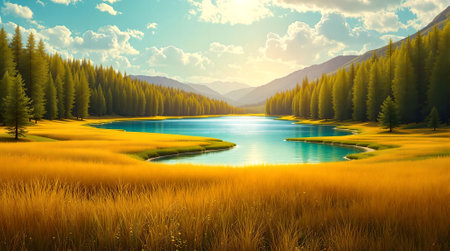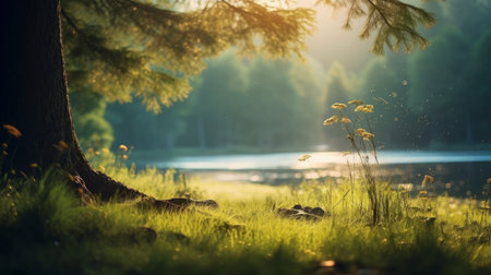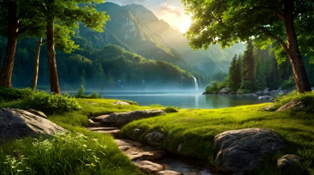 AI Generated. Over range hiking lined beautiful pastel sunlight spring blowing forest of glimmering hidden range with shore vintage colorful falling window