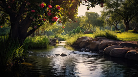 A breathtaking depiction of the Garden of Eden, filled with vibrant greenery, serene waters, and divine sunlight.