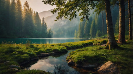 Beautiful landscape with mountain lake and green forest at sunrise in summer