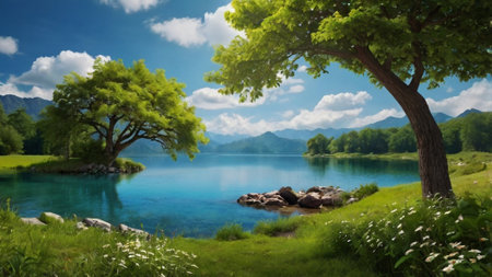 Peaceful lake background with calm water, green trees, and textured reflections. The serene, natural scene creates a tranquil, picturesque atmosphere, perfect for nature or wellness themes