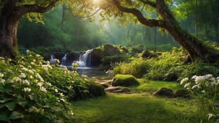 A tranquil scene captures a stream flowing through a vibrant green forest. Sunlight filters through the trees, illuminating the water and foliage. The image displays a natural composition with soft textures and varying shades of green. Suitable for diverse applications, including nature, environment, and wellness content.