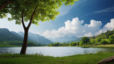 Bright summer panoramic landscape with beautiful lake and green hills during sunny day.summer landscape with field, lake and trees, reflection and cloudy sky.
