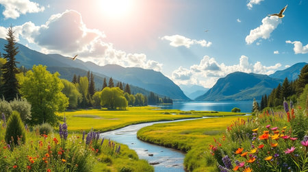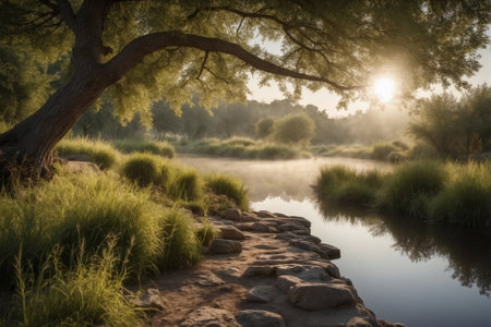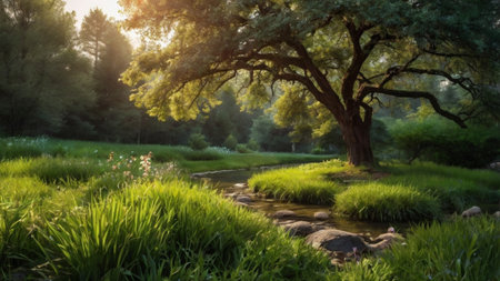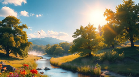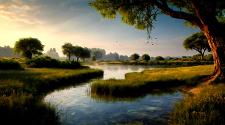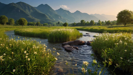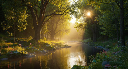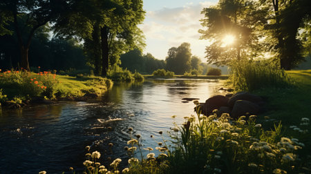 a serene and peaceful ambiance is captured in this uhd image of a small river adorned with plants, basking in the warm sunlight. reminiscent of poetic pastoral scenes from the danish golden age, this snapshot aesthetic, created in the style of unreal engine, showcases the beauty of nature in a mesmerizing 32k uhd resolution. ai generated
