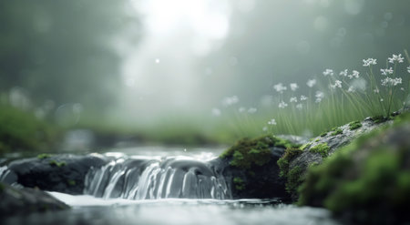 Gentle water cascades over rocks in a serene stream, surrounded by lush greenery and delicate flowers, as morning mist envelops the forest, creating a peaceful atmosphere.