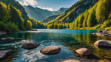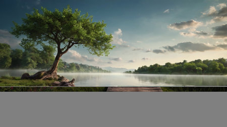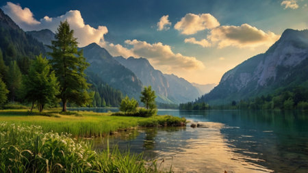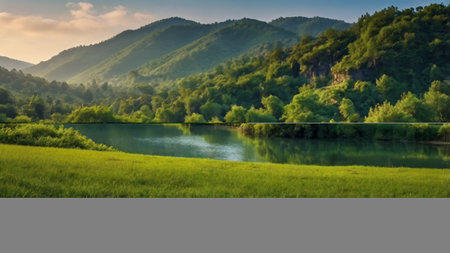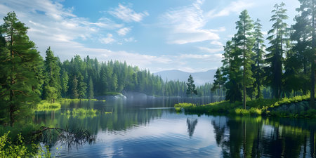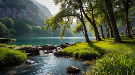 beauty of a tranquil lake, surrounded by lush greenery and mirrored reflections. Generative AI