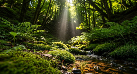 Sun beams over a stream in the forest with moss and ferns