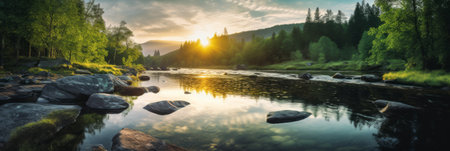 Beautiful landscape with mountain river at sunset. Nature background. Panorama