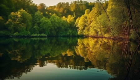 Tranquil scene of autumn forest reflected in tranquil water surface generated by artificial intelligence