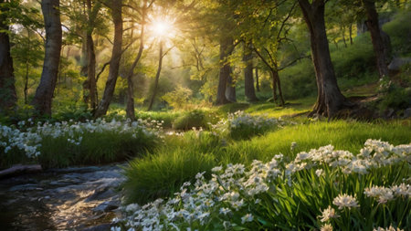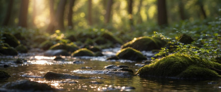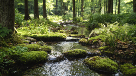 A serene stream flows through a vibrant forest, with clear water glistening and lush moss covering the rocks. Sunlight filters through the trees, creating a peaceful atmosphere.