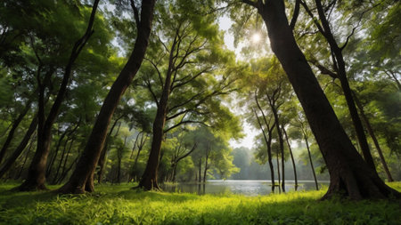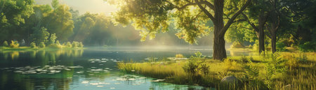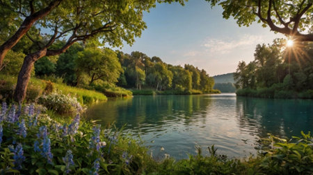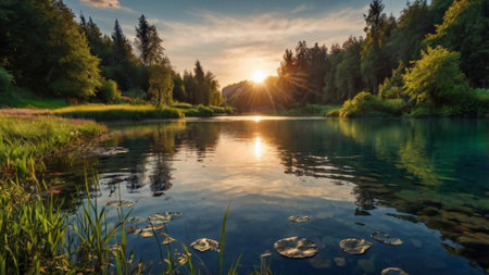A serene scene of a sunlit forest lake with tranquil waters, surrounded by lush greenery and trees, reflecting the calm atmosphere.