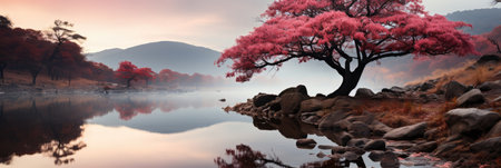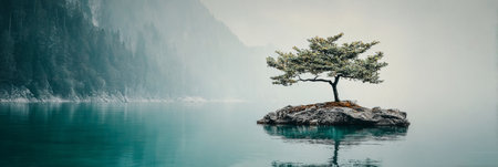 A captivating scene featuring a solitary pine tree on a rock island, reflecting in the calm waters of a serene lake surrounded by lush forest and misty mountains.