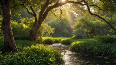 Sunlight Streaming Through Forest Canopy Illuminating Serene Creek