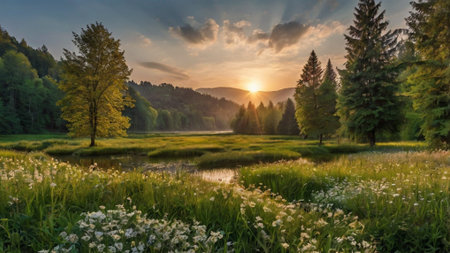 Beautiful summer landscape with mountain river and green meadow at sunset
