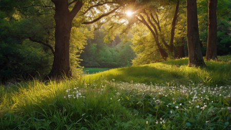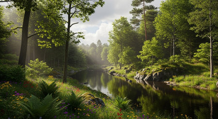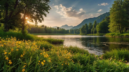 A serene riverbank with vibrant green grass and delicate wildflowers creates a peaceful environment. The soft natural light enhances the beauty of this tranquil scene.