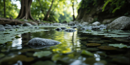 AI Generated. Crossing tranquil waters rocky river pathways serene stream nature exploration lush greenery ground level adventure and relaxation