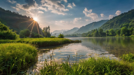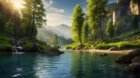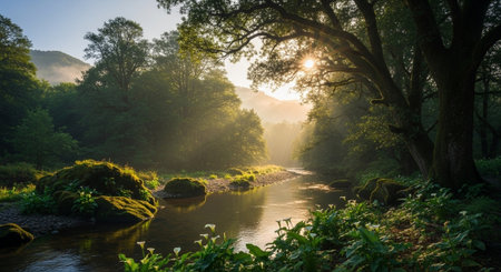 A tranquil river flows through verdant mountains, enveloped in morning mist. The serene landscape captures the essence of nature's beauty and calmness at dawn.