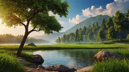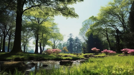 beautiful spring landscape with river and trees in the park, 3d rendering