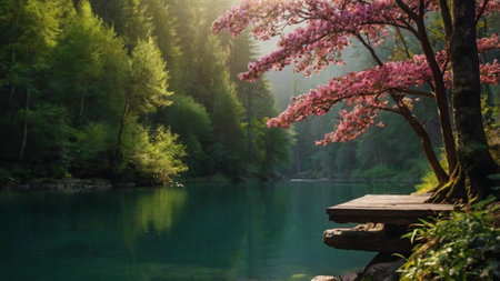 Beautiful spring landscape with blooming sakura tree and lake.