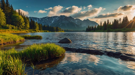 Beautiful landscape of a mountain lake in the forest with trees and grass