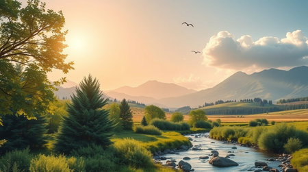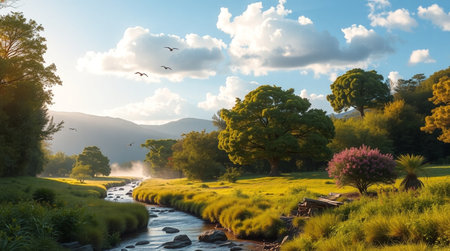 an idyllic rural scene captured in the style of mikko lagerstedt and ivan shishkin. the photo showcases adam and anbesh creek, nestled amidst trees and rocks. the golden light and lens flare add a charming touch to the picturesque rural landscape. this 32k uhd image beautifully captures the essence of rural landscapes. ai generated