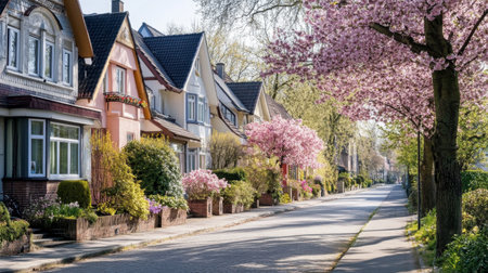 A picturesque residential street featuring vibrant cherry trees in full bloom during spring. Charming houses create a serene atmosphere in a sunny neighborhood.