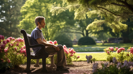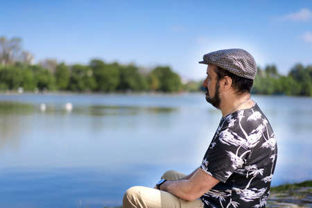 Portrait of a man sitting relaxed contemplating a lake. copy-space