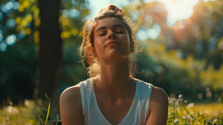 Beautiful young woman with closed eyes breathing relaxing enjoying sun at sunset. Beauty sunshine girl portrait.