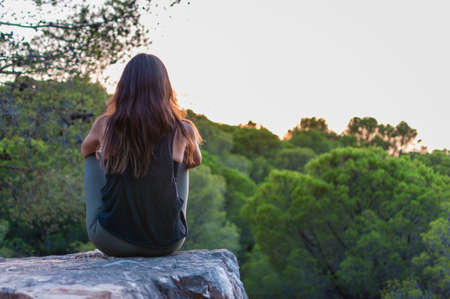 Young woman sits on top of a rock, with her back to the camera, surrounded by green treetops at sunset