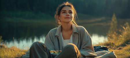 Woman sitting in golden sunset light by a tranquil lake, eyes closed in peaceful reflection. Represents sincerity, authenticity, and emotional strength.