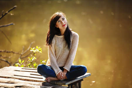 Young girl wearing a blue jeans, red checked shirt and black boots sitting on a wooden bridge by the lake. Teenage girl sitting outdoors. People, nature, travel concept.