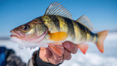 Hands of a fisherman grasp a small perch caught on ice, showing the thrill of winter outdoor activity in a bright blue setting.