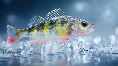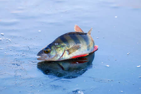 Caught perch rests on ice near a fishing hole, illuminated by bright winter light, showcasing a minimalist backdrop and frost details.