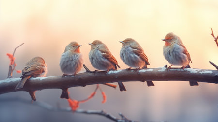 Five robin birds on the tree in the morning mist of an early autumn day. Generative AI.