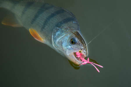 Fishing On Jig. Perch on the hook in the hand of angler above the water.