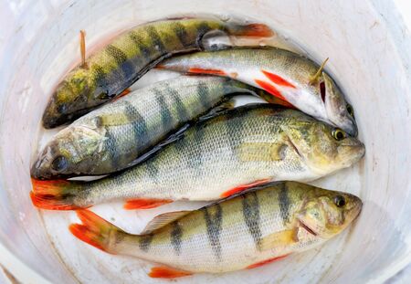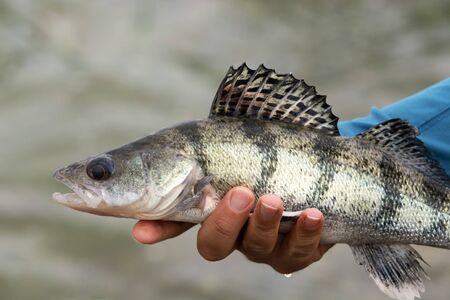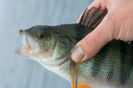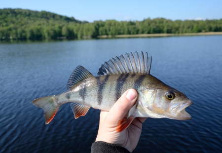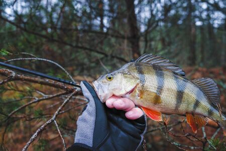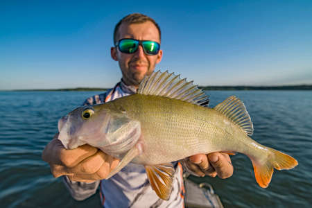 A small lake perch is a fishing trophy in a mans hands. A predatory fish