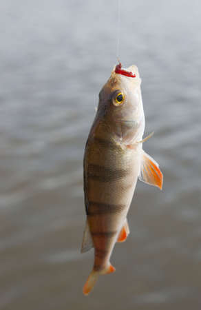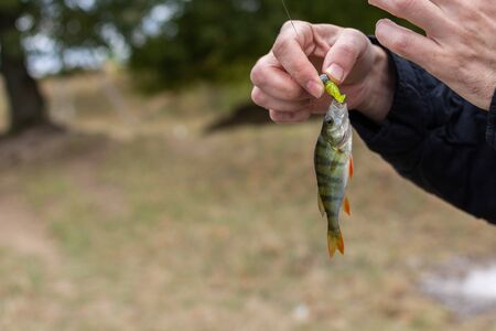 A good catch, fisherman holds fishing line with caught fish,little perch on a fishing rod hook