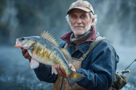 Happy angler proudly displaying a trophy perch caught during a peaceful fishing trip in a serene lakeside environment on a crisp morning