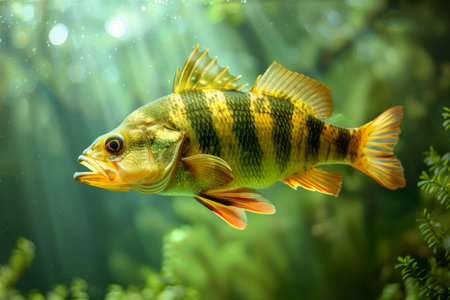 Colorful close-up of a spotted fish swimming among rich aquatic vegetation, showcasing intricate scale patterns and fins. captures the serene beauty of underwater ecosystems and the vibrant life within them. Generative AI