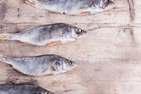 Fresh fish. Fresh river fish perch. On a yellow wooden background. Top view