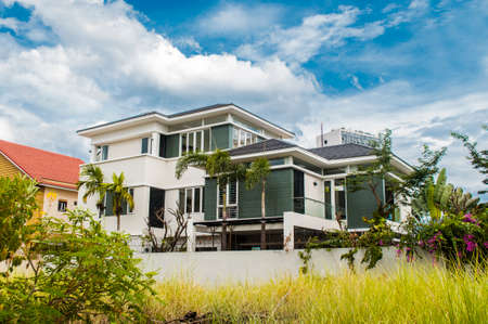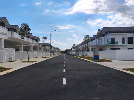 SEREMBAN, MALAYSIA -APRIL 07, 2020: New double story luxury terrace house under construction in Malaysia. Designed by an architect with a modern and contemporary style.