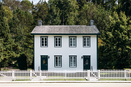 Chambord, Canada - August 18, 2025: Restored white two-story house with green trim and picket fence at Val-Jalbert Historical Village in Quebec