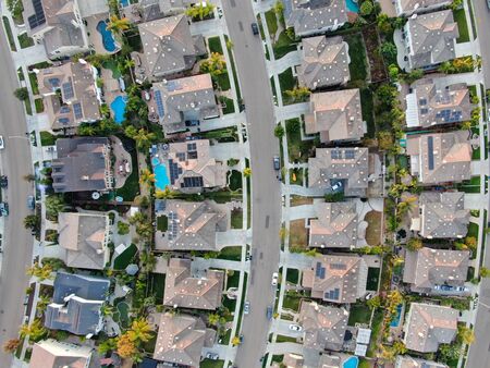 Aerial top view of residential modern subdivision luxury house neighborhood. South California, USA