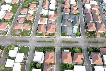 Housing estate in aerial view. That village or community consist of residential building in land lot. Real estate or property from land development by construction, subdivision for sale, rent and buy.