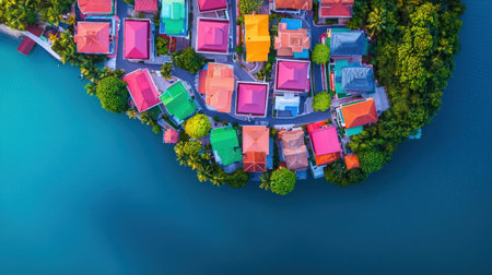 An aerial shot showcasing a vibrant cluster of houses with colorful roofs on a small island, set against the backdrop of serene blue water.
