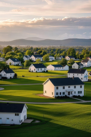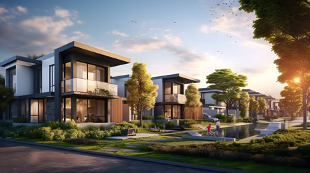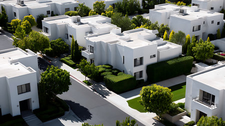 Modern suburban houses among lush green spaces, Sustainable urban neighborhood. Aerial view of city with building and streets