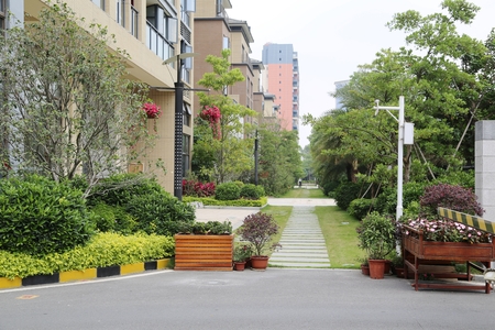 A stunning view of modern residential buildings featuring sleek architecture, vibrant landscaping, and a clear blue sky, creating a peaceful urban oasis.
