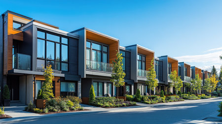 A row of residential townhomes or townhouses in suburb, Concept of real estate development, the housing market, and homeownership