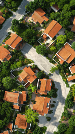 Capturing an aerial view of a picturesque residential area filled with distinct orange roofed houses nestled in a lush landscape of trees and shrubs