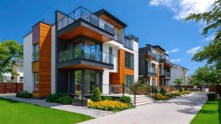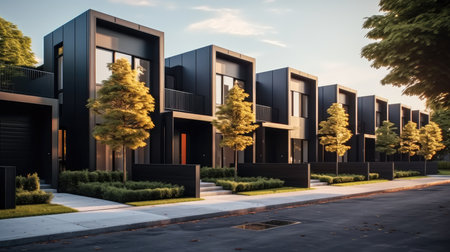 Appearance of residential architecture. Modern modular private townhouses. Residential minimalist architecture exterior. Very modern neighborhood, early morning shot.