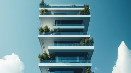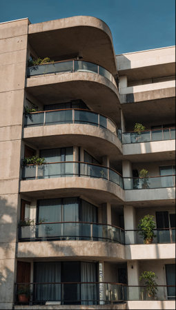 AI Generated. Modern building architecture with balconies under clear blue sky on a sunny day